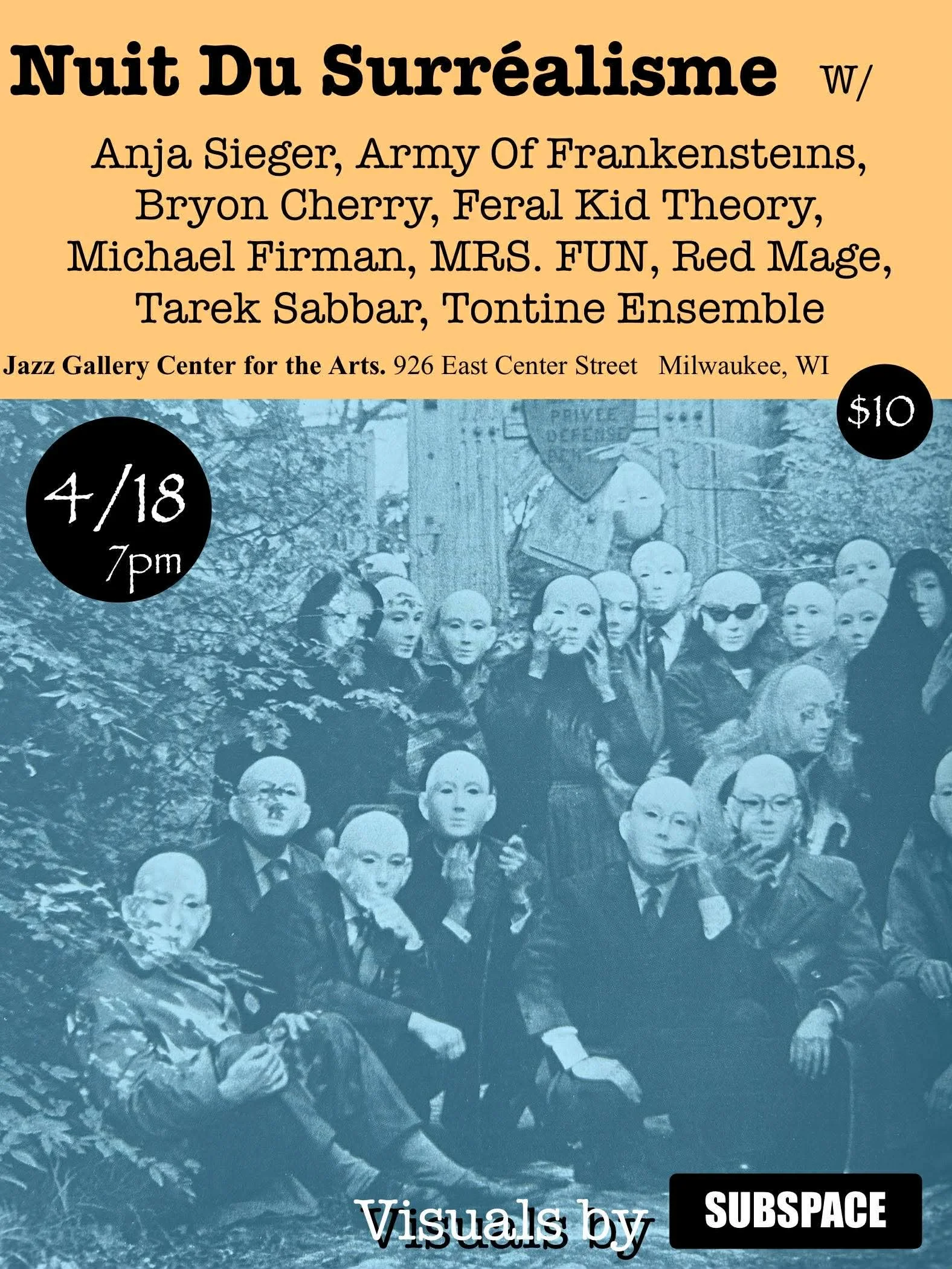 Join us for Nuit du Surréalisme, a night of experimental sound and art! This event will feature performances by Anja Notanja Sieger, Army of Frankensteins, Bryon Cherry, Feral Kid Theory, Michael Firman, MRS. FUN, Red Mage, Tarek Sabbar, and Tontine Ensemble.
