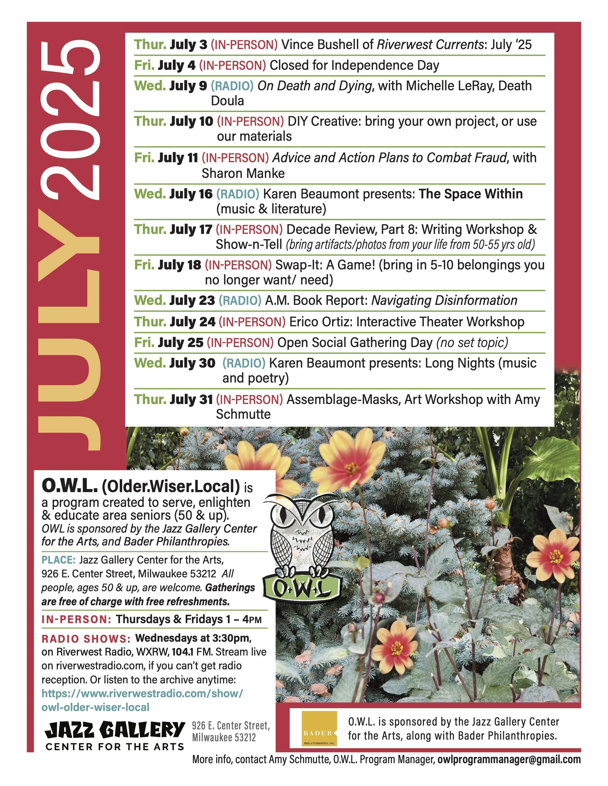 O.W.L. (Older. Wiser. Local) is a program created to serve, enlighten & educate area seniors (50 & up). OWL is sponsored by the Jazz Gallery Center for the Arts, and Bader Philanthropies.